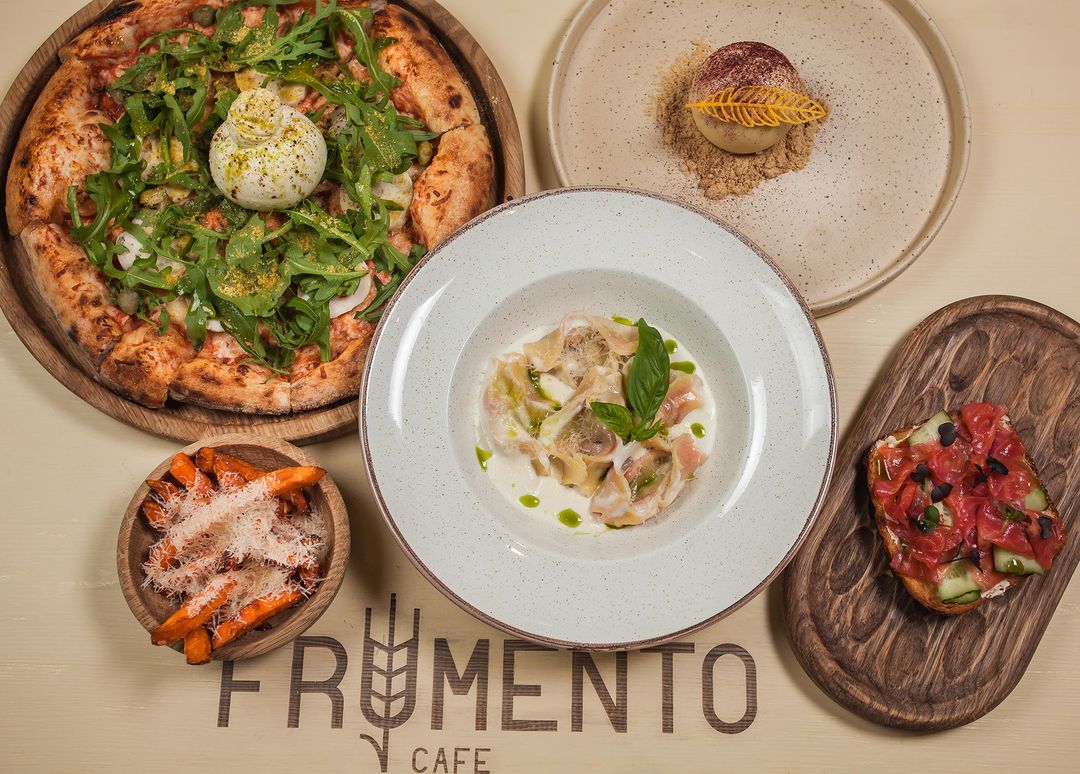 До 13.00 здесь подают завтраки: овсянку с разными добавками, оладьи с амарантом и креветками, кукурузное суфле с грибами. В основном меню – пицца, паста и всевозможные закуски.