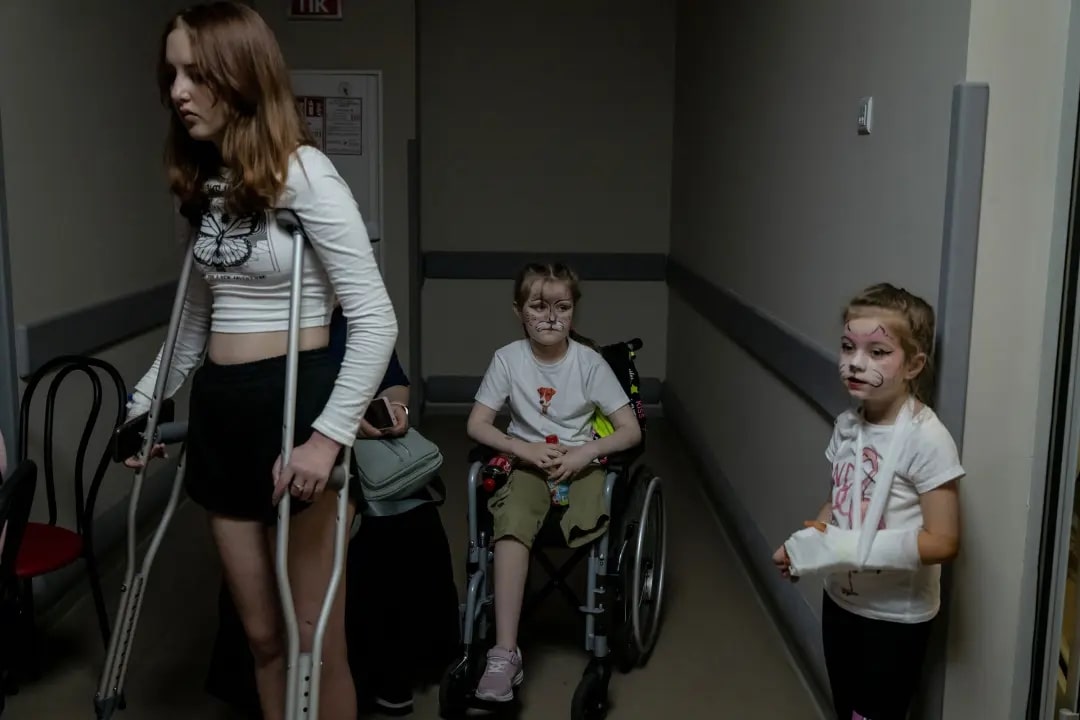 - кадр Николь Танг для NYT, изображающий маленьких пациентов с разрисованными лицами в укрытии «Охматдета» в Киеве;