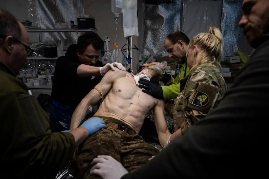 - фото Евгения Малолетки для AP, на котором врачи спасают раненого защитника возле Бахмута 26 февраля;