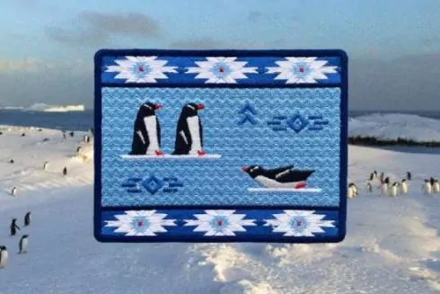 На шевроне изображены субантарктические пингвины, являющиеся самыми многочисленными соседями наших полярников. Ромбы взяты из домашнего ковра бабушки Юры, соучредителя «Яверета». Полоса геометрических фигур – из подольского ковра, но в цветах юга планеты. Автор дизайна – Кристина Дмитрук.