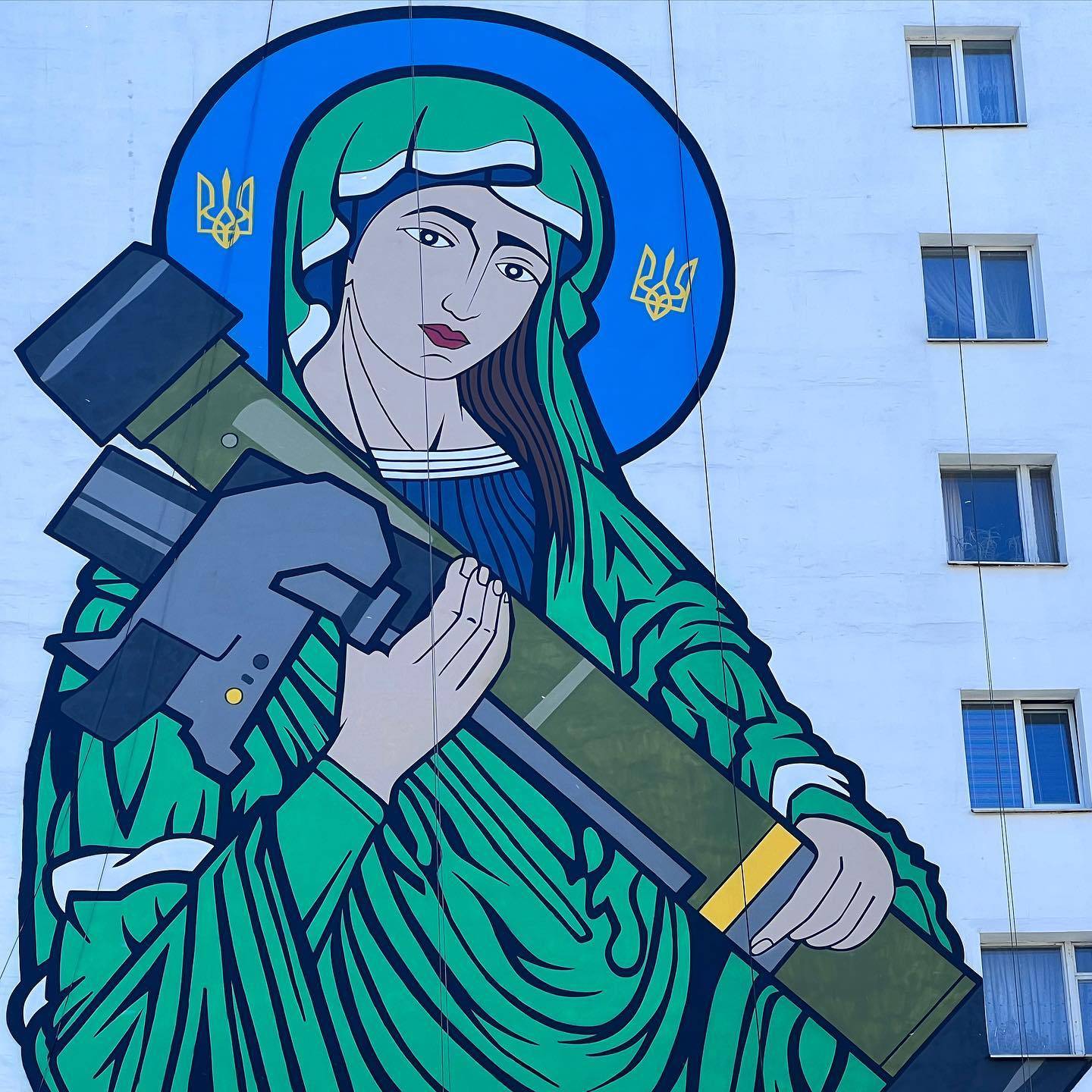 На новой мурале изображена символическая мадонна с переносным противотанковым ракетным комплексом «Джавелин», который используют украинские защитники в войне с российскими захватчиками.