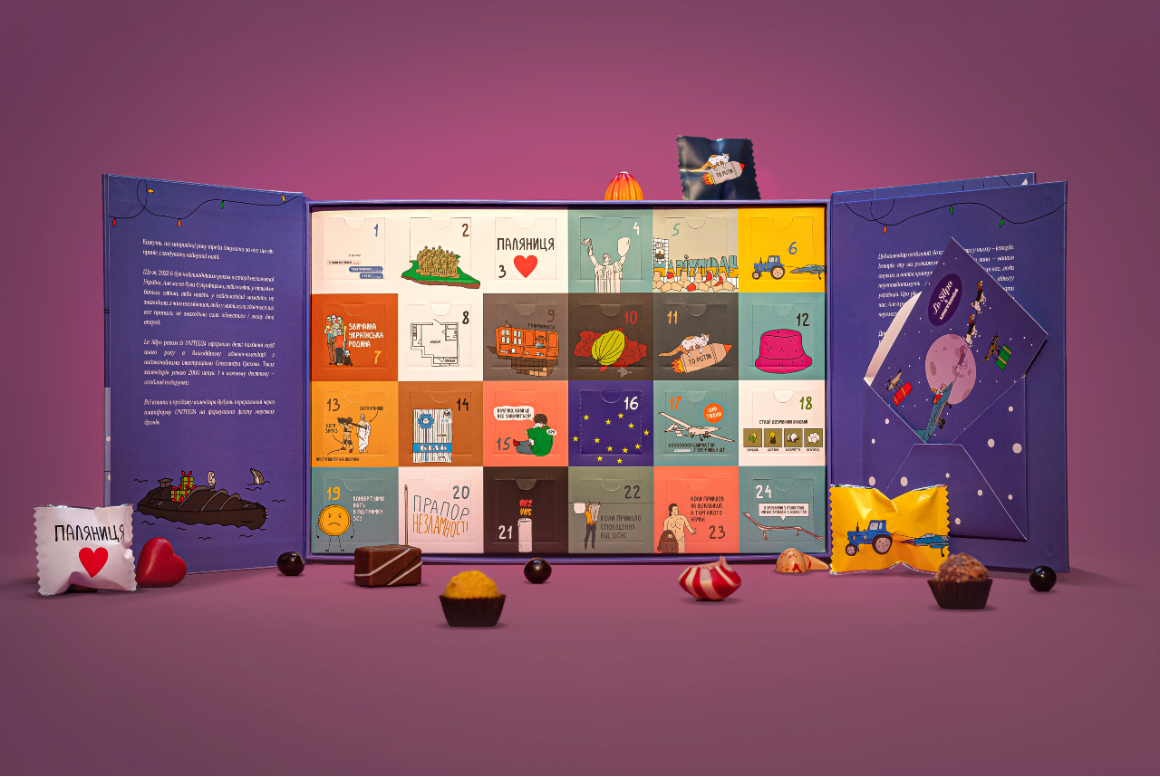 Кроме того, компания выпустила специальный тираж – 100 штук. В нем – три дополнительные конфеты от кондитерской Honey, созданные в форме “бавовни”, самолета «Мрия» и пса Патрона, а также гарантированные подарки в каждой коробке. Среди них футбольный мяч с автографом Андрея Шевченко, боксерские перчатки от Александра Усика, постер с подписью астронавта Скотта Келли, виниловые пластинки Dragons и т.д. Стоимость календаря – 9 950 гривен.