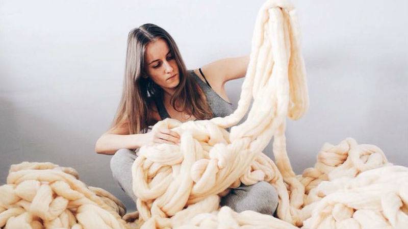 Киевлянка Анна Мо решила вязать суперобъемные одеяла, шапки, свитера, шарфы и пледы из шерсти овец породы меринос. Изделия она вяжет либо руками, либо огромными деревянными спицами, сделанными на заказ.