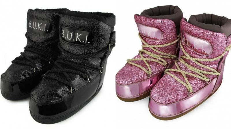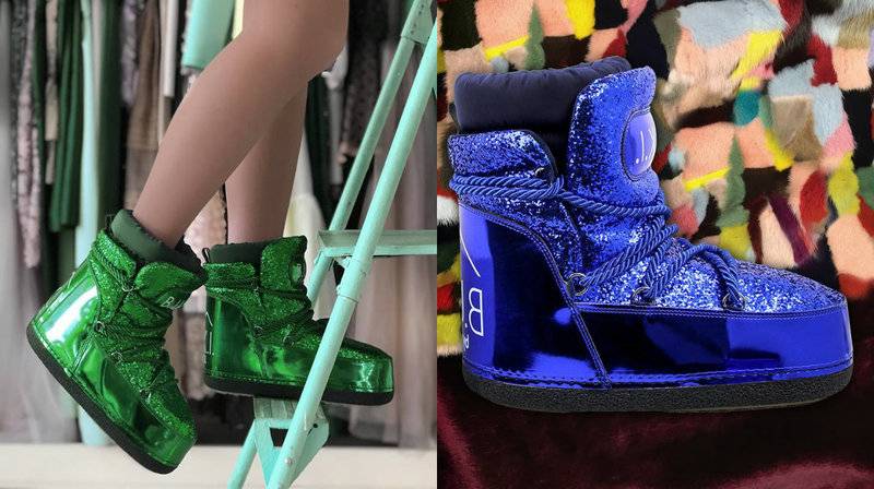 Космические луноходы-дутики ярко-зеленого, ярко-синего, розового, кофейного, черного, золотого и серебряного цвета с блестками. Производители уверяют, что эта обувь вообще не боится морозов – благодаря шерстяному утеплителю и воздушной подушке, которая есть между стопой и плоскостью подошвы.