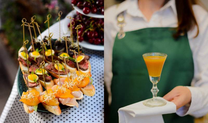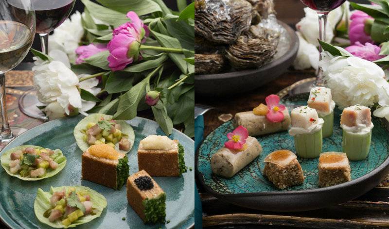 Также есть горячие закуски и основные блюда: паштет из печени цесарки и фазана, устрицы с тремя соусами, филе сома с цитрусами и попкорном из риса, виноградные улитки, жульен с грибами и раковыми шейками.