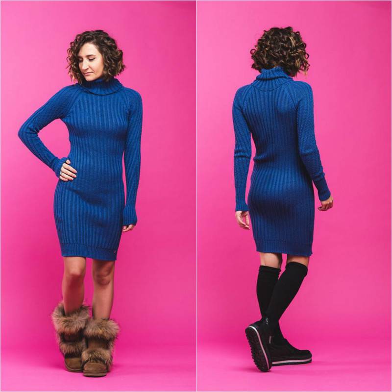 Платье с силуэтом по фигуре и длиной до колена связано без единого шва. Для его изготовления была использована пряжа итальянской фабрики DiVe из северного региона Biella. Состав пряжи - 50% мериносовая шерсть, 50% - акрил. Цвета: синий, серый, черный.