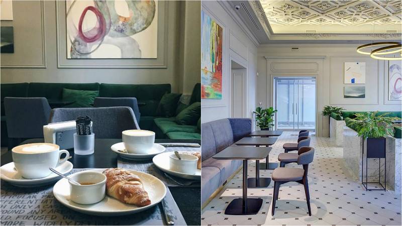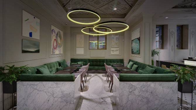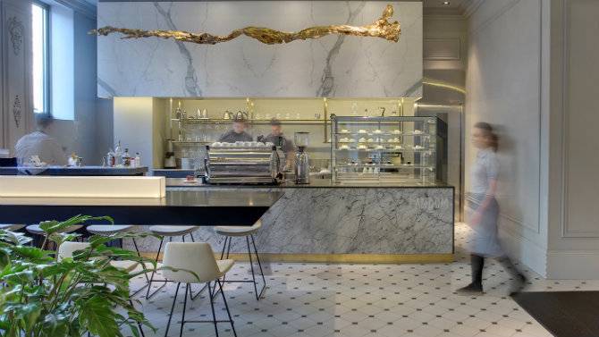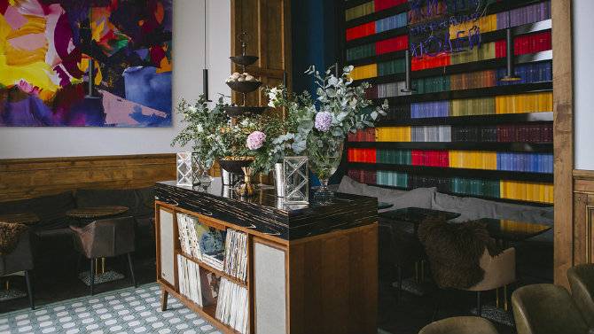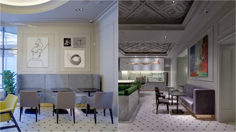 В дизайне заведения сплелись итальянские, британские и португальские мотивы. На стенах изображены репродукции Боттичелли, а светильники сделаны в виде золотистых нимбов. С дизайном Дмитрию помогла талантливая Анна Гри.