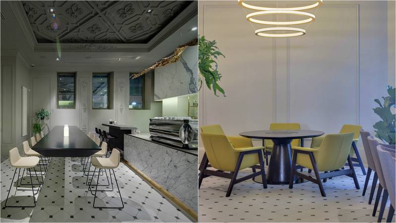 Дизайн заведения выполнен в стиле лаконичной классики: светлые тона, мраморный бар, отделанный лепниной потолок, яркие диваны зеленого, желтого, серого цветов и серебряно-золотистые детали. На стенах - современные произведения искусства. Над оформлением работали архитектурное бюро 2В Group - Слава Балбек и Андрей Березинский. Создатели утверждают, что Fandom Coffee Bar - это современное коктейльно-кофейное пространство для настоящих кофеманов.