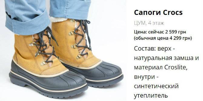 Сапоги Crocs, как и вся обувь бренда, отличается легкостью. Вряд ли они будут смотреться уместно в офисе или клубе, но для долгих прогулок на природе они окажутся незаменимы. Подошва сапог ребристая, что обеспечивает устойчивость. Поверхность водоотталкивающая, а внутри сапоги утеплены современными материалами, что позволяет им выдерживать мороз до 25 градусов.