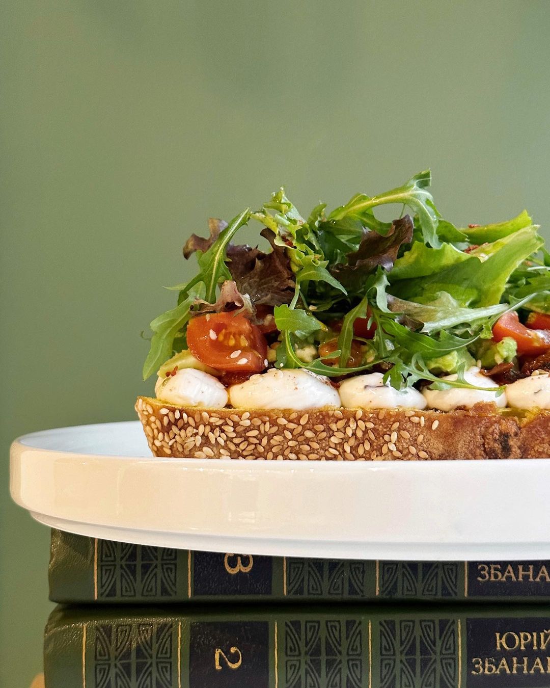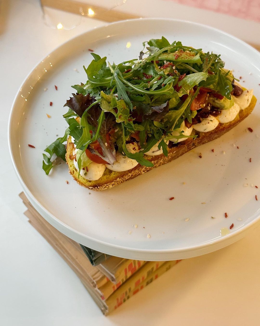 В меню завтраков – сет из творожного скрэмбла, салата и круассана с тунцом или хамоном, авокадо-тост, брускета с хамоном, бездрожжевая лепешка с песто и печеным перцем и сырники.