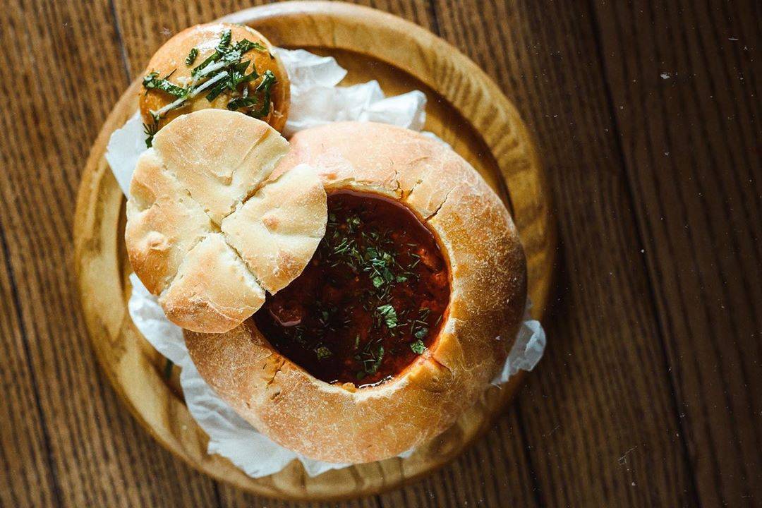 В ресторане можно заказать разнообразные завтраки: сырники, овсяную пасту с хурмой-гриль, яичницу. Среди закусок — бутерброды, хумус с креветками и кальмарами, оладьи и чесночный хлеб. Также в ресторане подают первые блюда: борщ и супы в выпеченном хлебе. Мясные, рыбные и овощные блюда готовят на гриле. Из напитков в наличии есть чай, кофе, вино, пиво, сидр, крепкий алкоголь и коктейли.