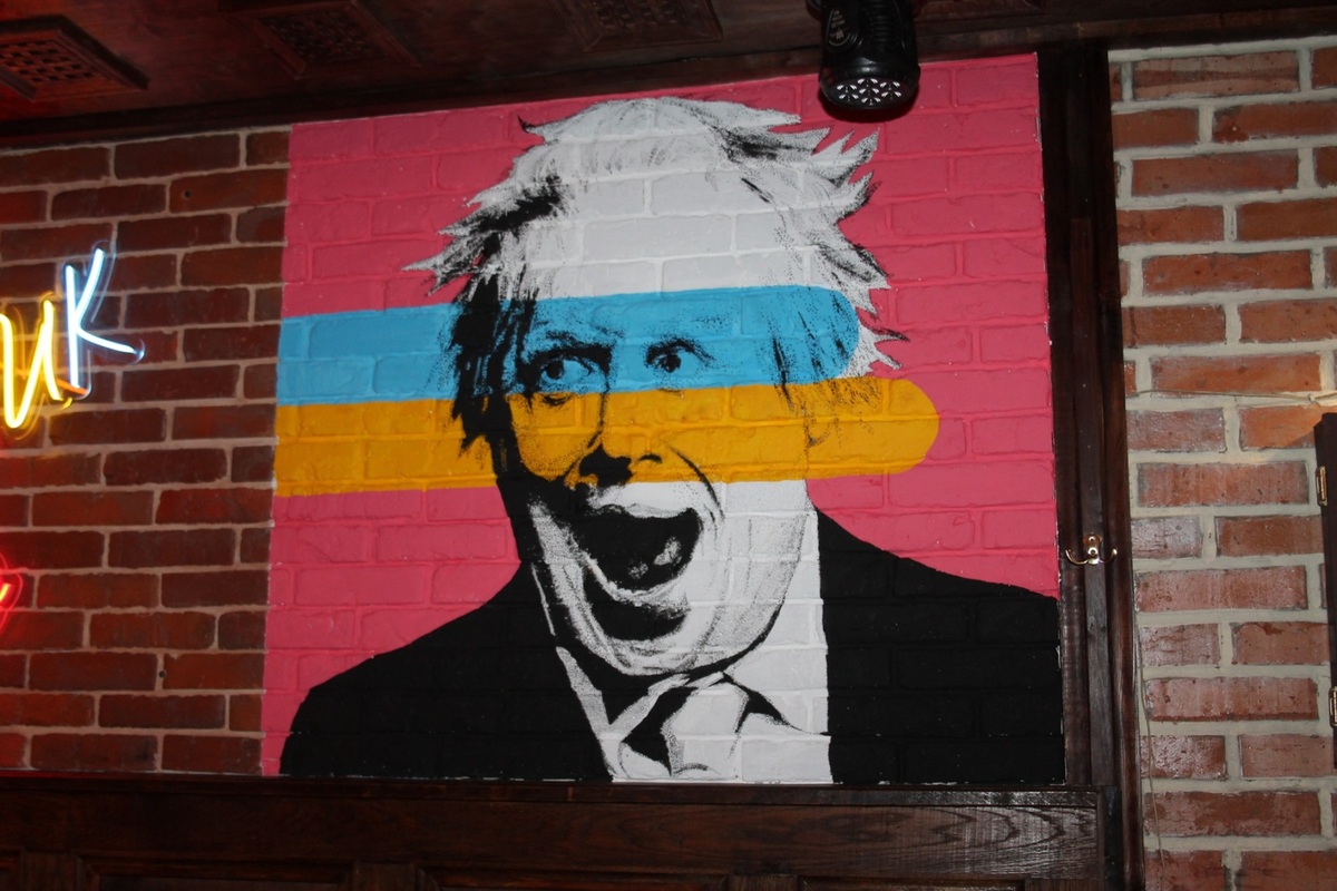 Паб украшен муралом с изображением британского политика, а над барной стойкой висит его легендарная фраза «Добрый день, everybody», которую Джонсон сказал украинским военным.