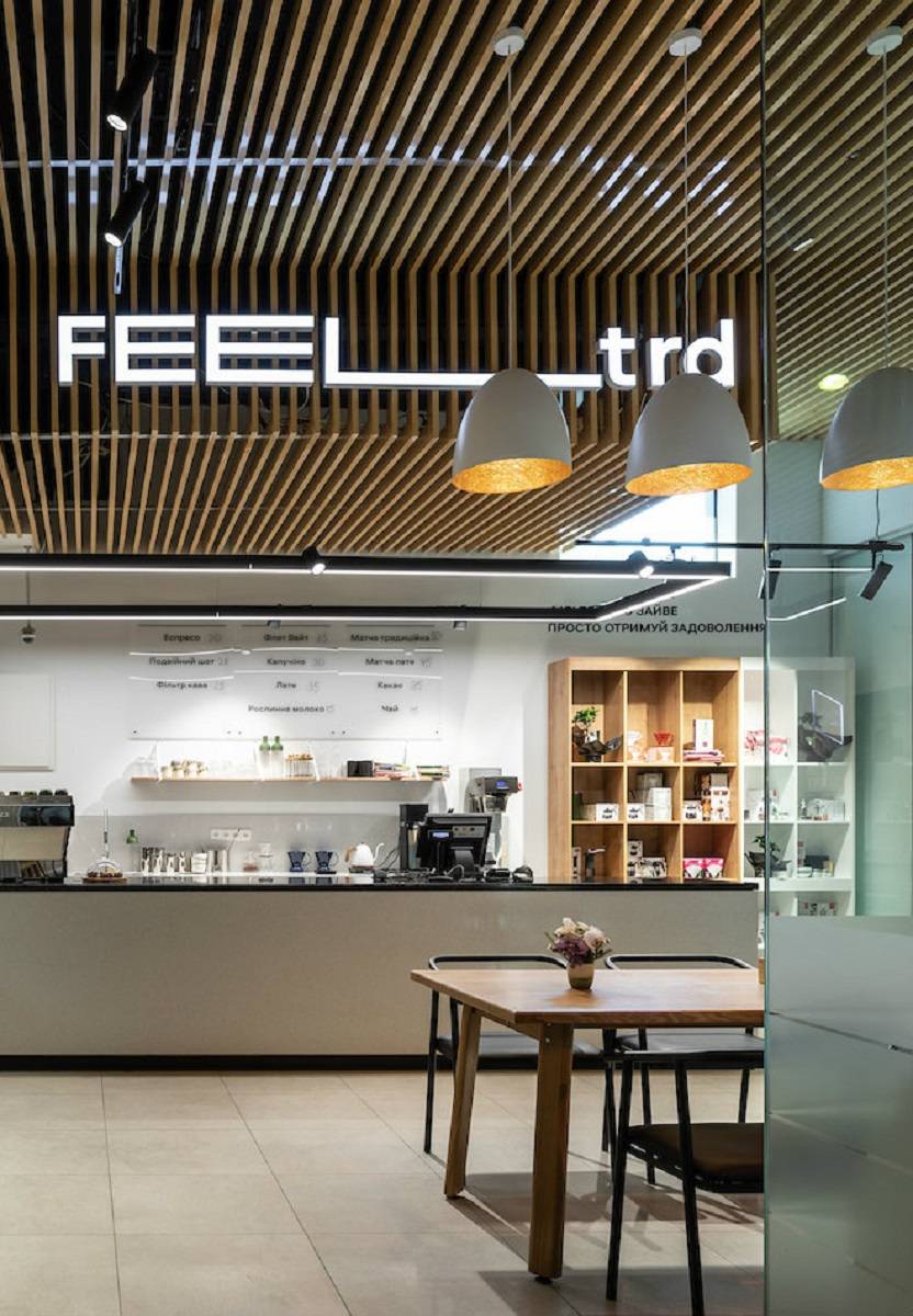 Бренд Feeltrd соединил в себе слова Filtered (отфильтрованный) и Feel (чувства). Интерьер кафе выполнен в современном минималистическом стиле с элементами дерева и металла.