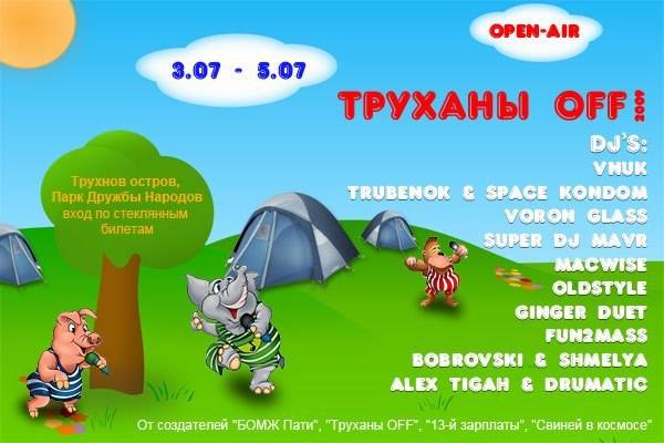 Первая эпоха Труханов охватывает 2008-2009 года. Тогда организацией в основном занимался Андрей Макаренко. Нынешний же главный организатор Александр Цыганок, по его словам, тогда был еще “младшим научным сотрудником”. За музыкальную составляющую отвечал диджей и журналист Влад Фисун, чем продолжает заниматься и сейчас. В те года Труханы проводили в парке Дружбы народов на берегу реки Десенка, подальше от цивилизации. Отсюда и название: парк находится на Трухановом острове. Приставка off - это просто «всё», - эмоционально объясняет Александр.