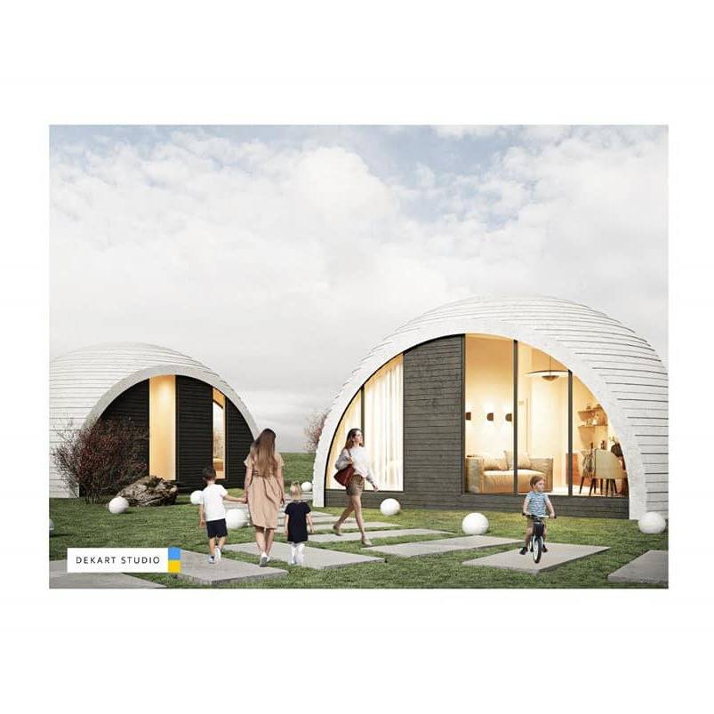 Предполагается, что жилье будет представлять собой круглые дома из экологических материалов, в которых смогут разместиться как маленькие, так и многодетные семьи на строящихся после войны территориях. Кроме того, такие сооружения можно использовать под торговлю, сервис и административные нужды.