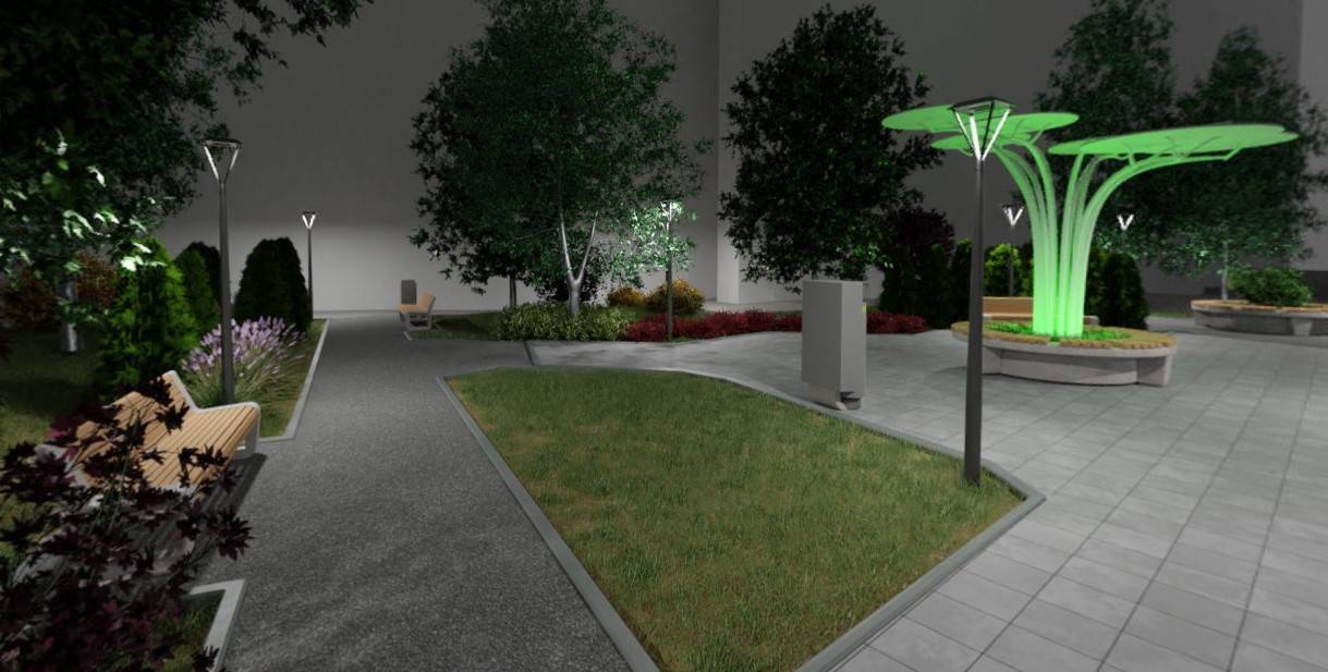 В центре парка сделают арт-объект с постоянной подсветкой. Он будет менять цвет на некоторое время, если посетители бросят использованные батарейки в специально установленные контейнеры. Кроме этого, в парке будут контейнеры для сортировки мусора.