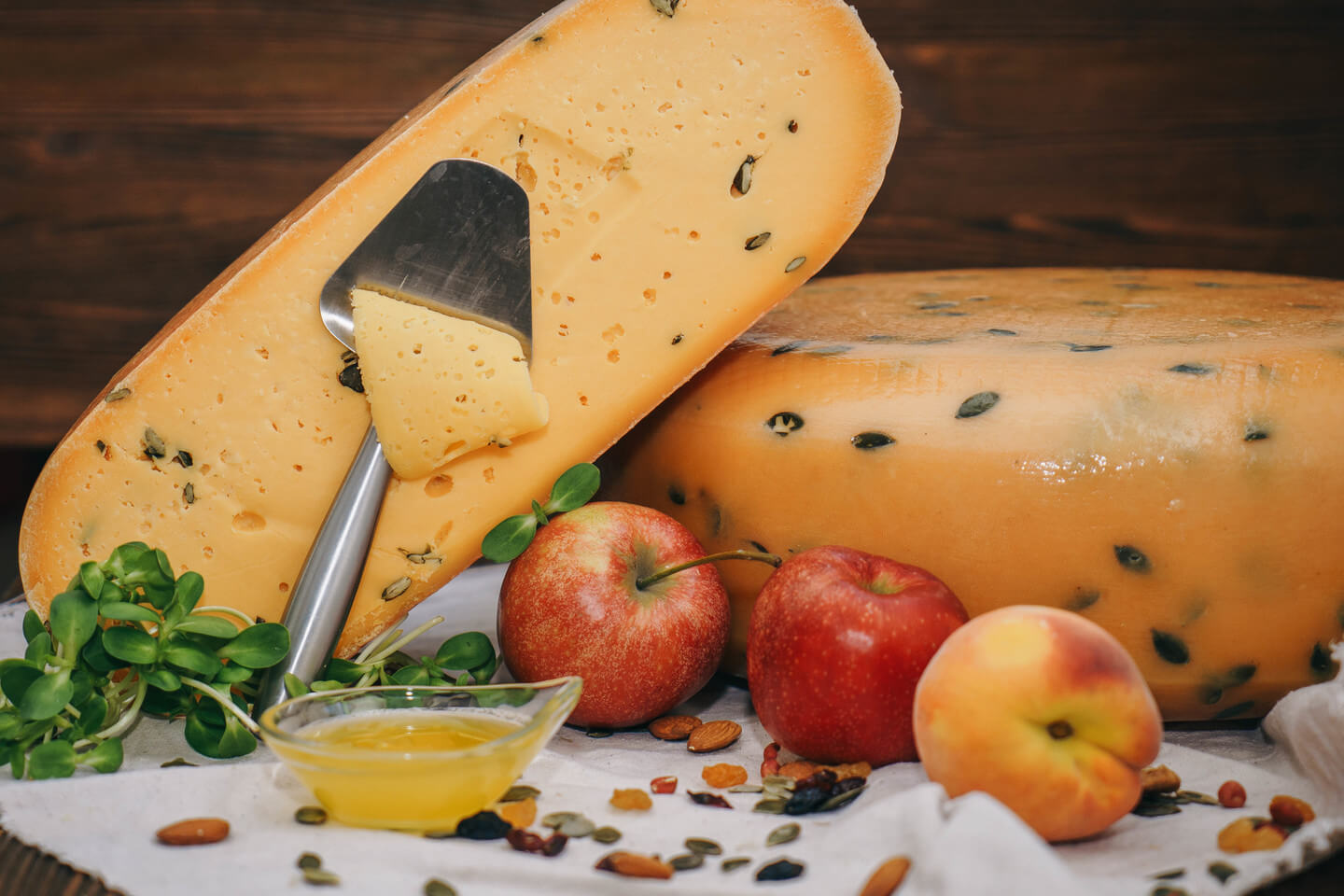Сир "Нарцис Карпат", який дозріває понад 6 місяців, та сир "Чорна рада" з чорнилами каракатиці, раклет та моцарела, сири з кавою та з віскі... Овечі, козячі, з буйволиного та коров'ячого молока.