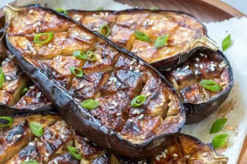 - Викласти баклажани зрізом догори на деко, змастити м’якоть кунжутною олією. Запікати 20–25 хвилин, доки краї підрум’яняться.
