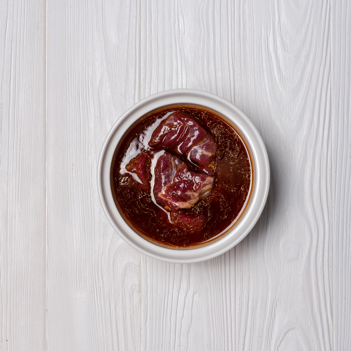 Змішай у глибокій ємності імбирний фреш, соєвий соус та кунжутну олію. Поріж м’ясо та поклади до отриманого розчину — залиш маринуватися від 2-х до 8-ми годин, залежно від того, наскільки жорстка свинина і наскільки м’яке м'ясо хочеш отримати. Чим ніжніше потрібне — тим довше йому слід маринуватися.