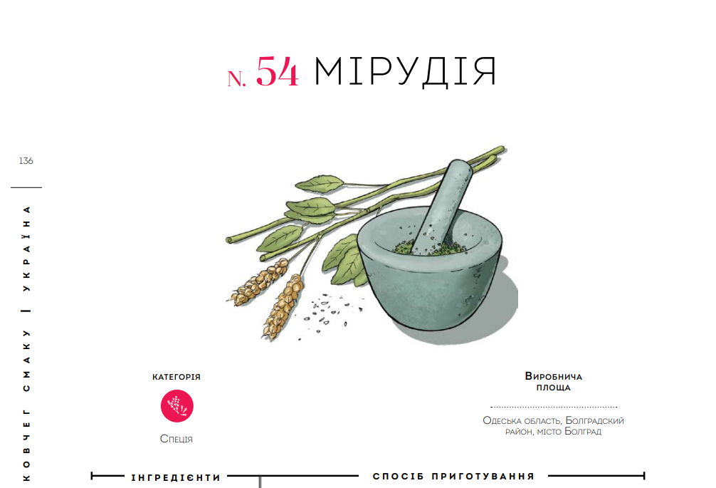 Є рецепти приготування поліського мацика, деталі про шинку, сало, ніжинські огірки, тощо. До атласу включили інформацію про кмин, чабан чай, мірудя тощо.