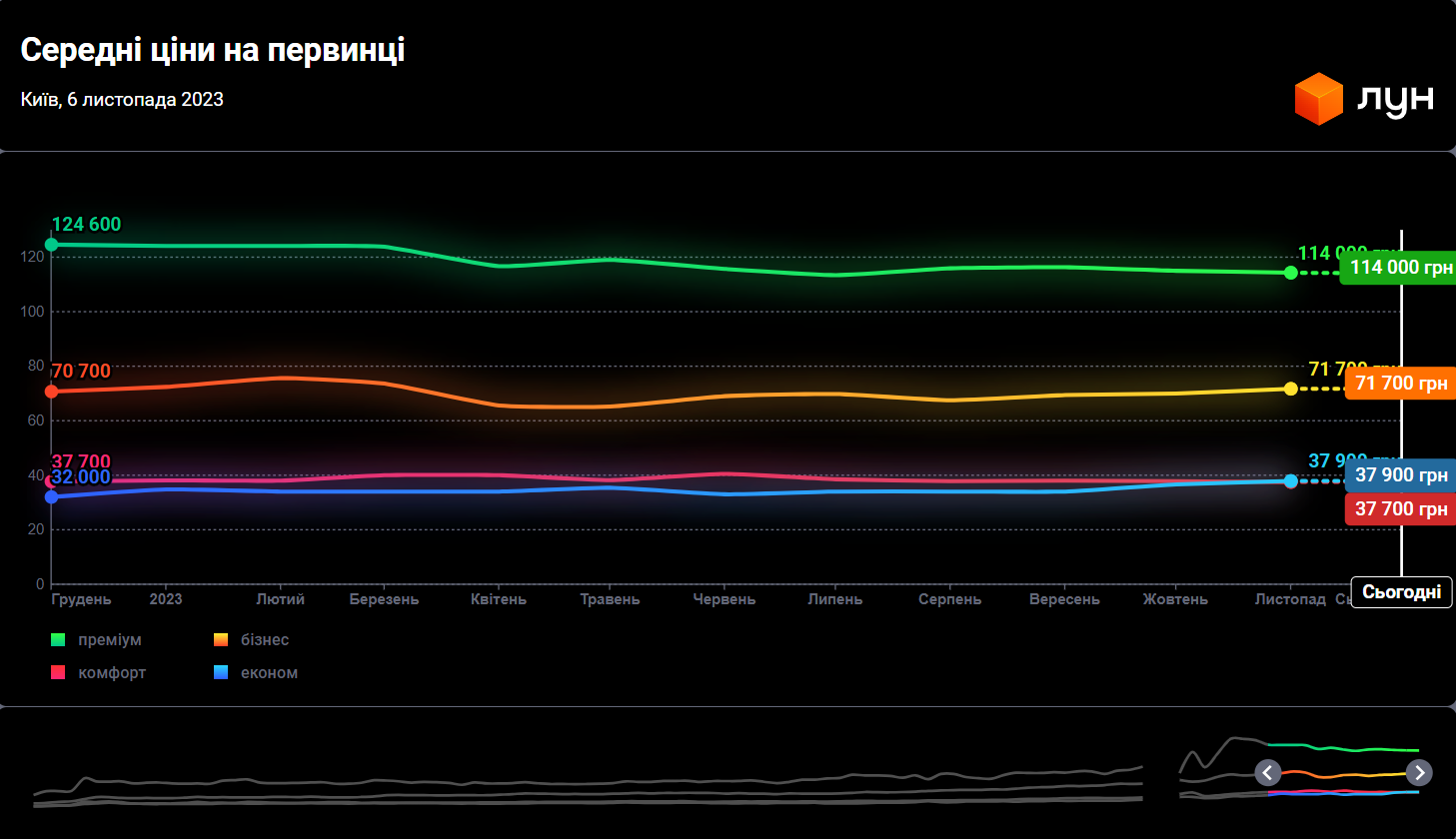 Тим часом ціна за квадратний метр у Києві росте. За даними ЛУН в червні квадратний метр в столичному ЖК економкласу коштував 33 тис грн, а станом на 6 листопада — 37,9 тис. грн. Метр в бізнес-класі у червні коштував 69 тис. грн, а станом на 6 листопада — 71,7 тис. грн.