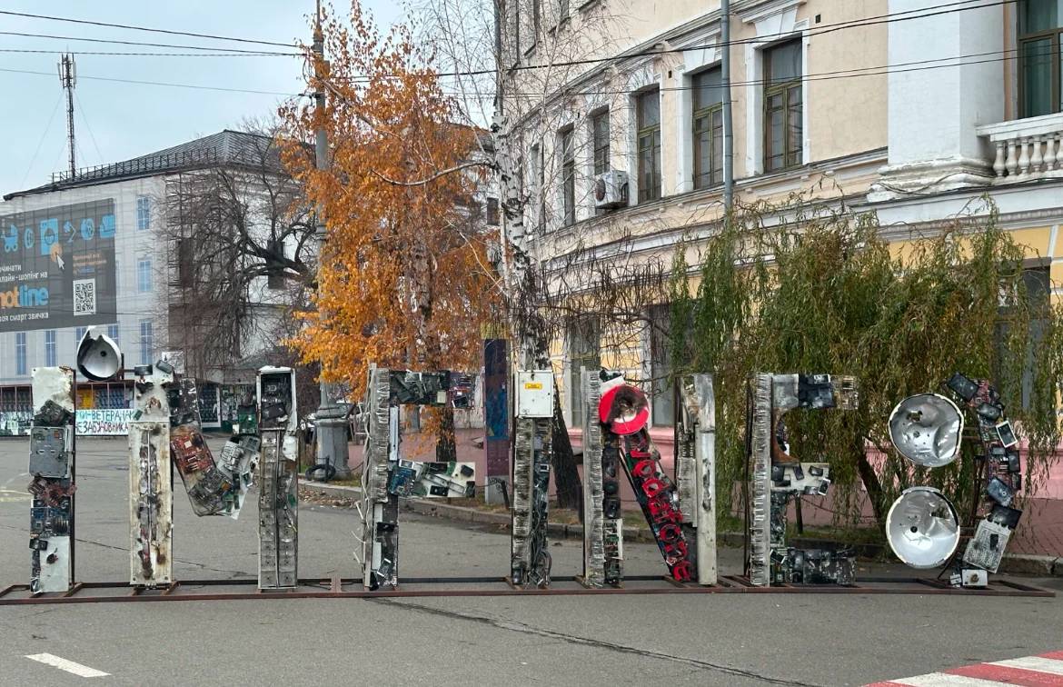 На Подолі встановили інсталяцію “I’m Fine”. Артоб’єкт створений з артефактів війни, зокрема пошкодженого телекомунікаційного обладнання, яке було зруйноване внаслідок повномасштабного вторгнення.