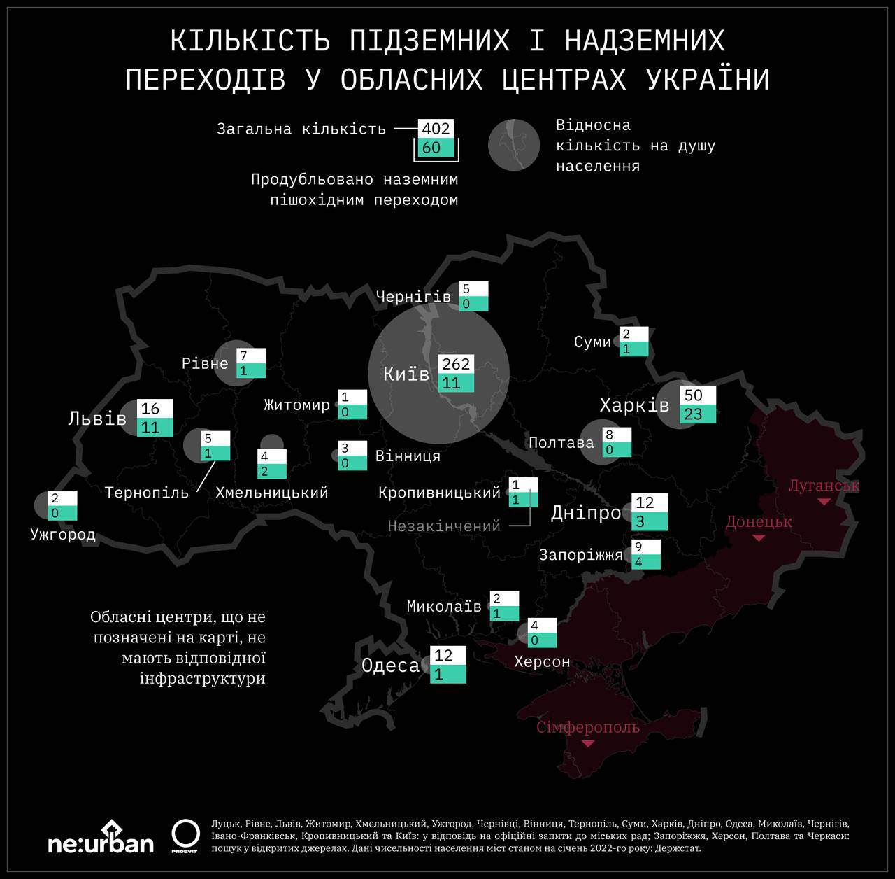 У Києві налічують 262 підземні та надземні пішохідні переходи. Частка продубльованих наземними переходами – лише 11 (4%), що є найменшим показником серед великих міст. У Львові продублювали 11 переходів із 16 (69%), а у Харкові — 23 із 50 (46%).