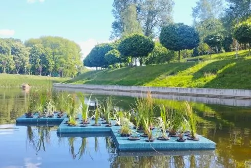 На водоймах у парках і скверах Києва почали встановлювати плавучі острови — спеціальні легкі платформи, що тримаються на поверхні водойм, засаджені вологолюбними рослинами: очеретом, рогозом, ірисом болотним, м’ятою водяною, осокою тощо.