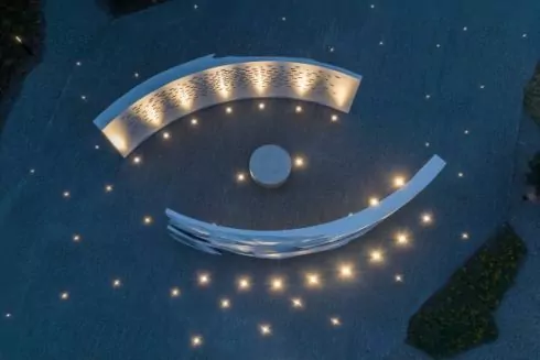 Стели виготовили з довговічних композитних матеріалів, стійких до природних стихій. У денному світлі рельєф підкреслює гра тіней, уночі – м’яке підсвічування.