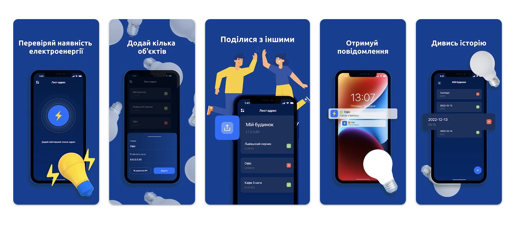 Цей мобільний додаток створений для попередження користувачів про відключення електроенергії у їхньому місті. Можна обрати Вінницьку, Дніпропетровську, Київську, Львівську, Миколаївську, Одеську, Тернопільську, Харківську, Чернігівську області та місто Київ для відстежування відключень світла.