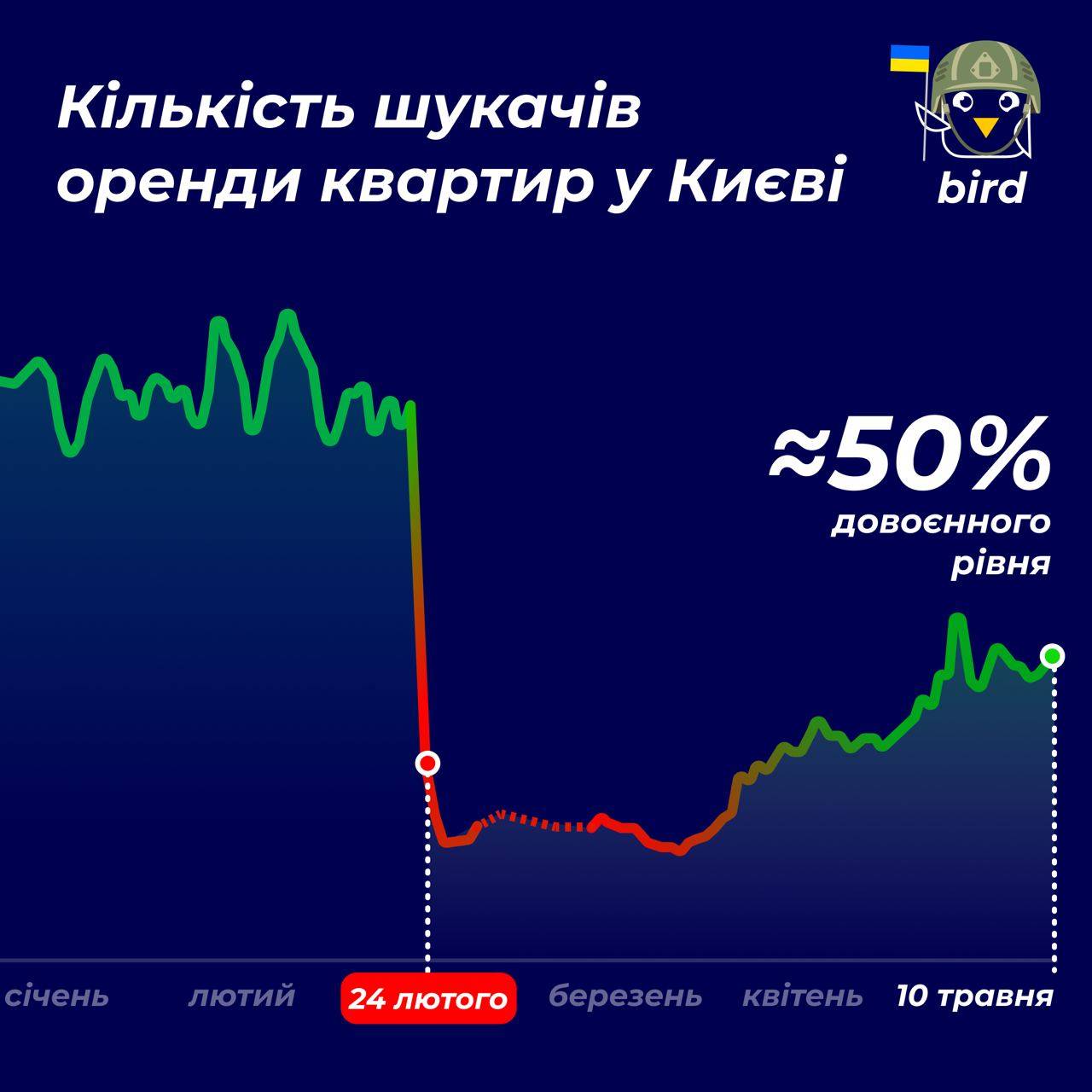 Середня ціна однокімнатної квартири у Києві з початку війни впала з 13 000 грн до 8000 грн. А кількість шукачів квартир становить 50% від довоєнного рівня, цей показник поступово зростає з квітня.
