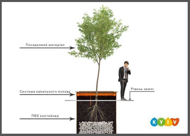 Усі дерева висадили в спеціальний семишаровий ґрунт і встановили сучасну систему поливу, яка порційно подає воду безпосередньо в прикореневу зону рослин.