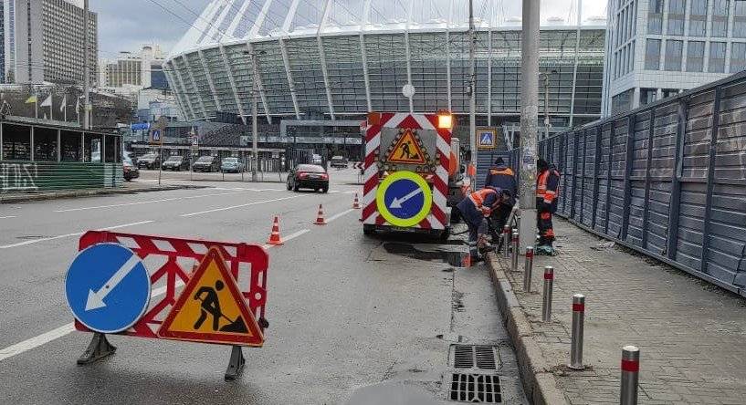 Фото. Біля НСК «Олімпійській» облаштовують антипаркувальні стовпчики