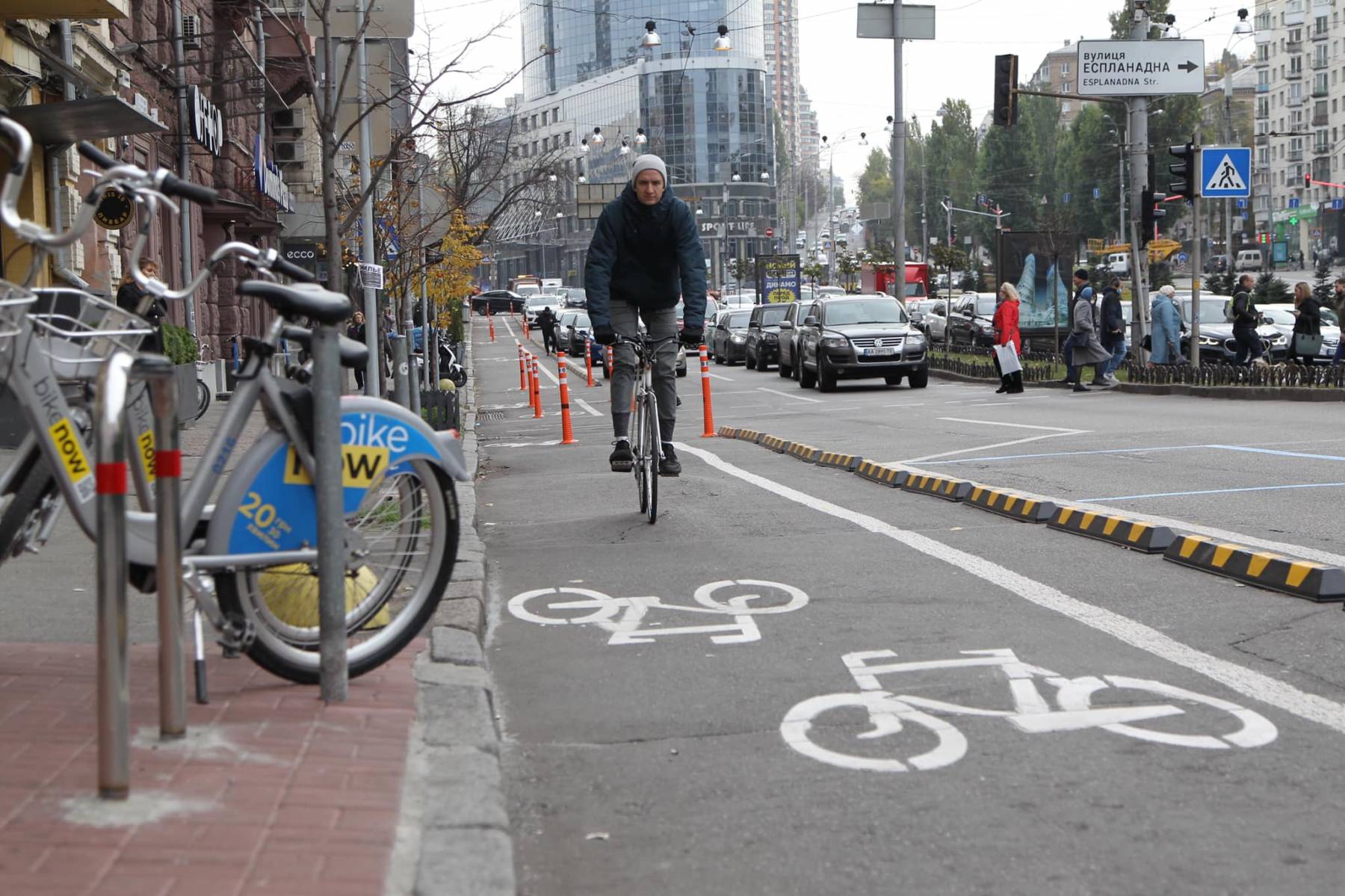 На Бессарабці облаштували пластиковий бордюр, який захищає велосмугу від автомобілів. Про це повідомив заступник голови КМДА Костянтин Усов.
