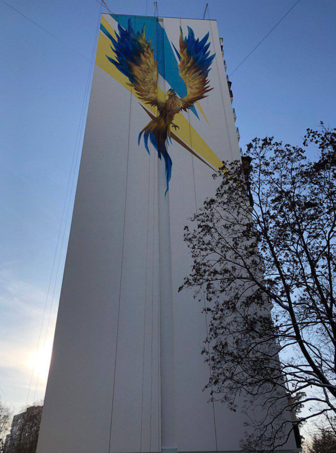 «Мурал із зображенням фенікса тепер прикрашає відреставровану багатоповерхівку у Святошинському районі Києва. Будівля була зруйнована російською ракетою 15 березня. Це лише початок. Відбудуємо всю Україну, будинок за будинком», – зазначили в Міноборони країни.