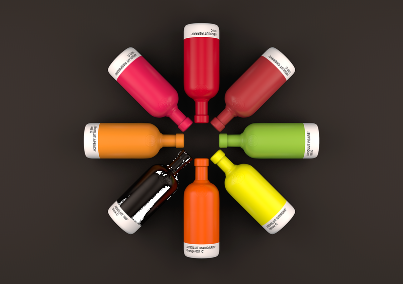 Привлекательная концепция серии водки Absolut, вдохновленная компанией Panthone. Студия — txaber.