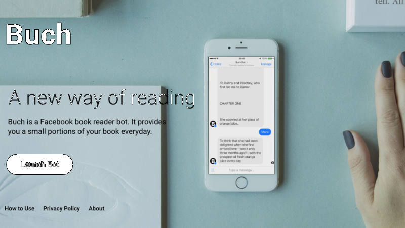 Больше всего наше внимание отбирают разнообразны мессенджеры. Именно поэтому чатботы так развиваются. BUCH — это особенный чатбот, ведь он показывает книги. То есть, цитирует их, страница за страницей, прямо в интерфейсе facebook-чата.