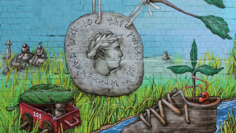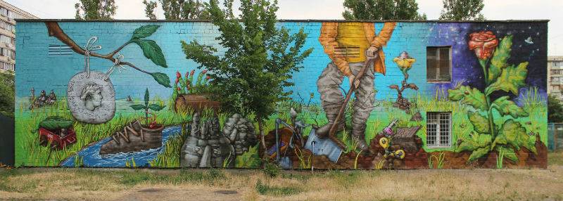 На ул. Маршала Малиновского, 30 Дима Фатум создал мурал об истории Оболони с древних времен и до наших дней. Зашифровал туда множество символов: римские монеты, листик в форме креста на плывущем ботинке, полено на земле — эти и все остальные элементы рисунка несут в себе смысл.
