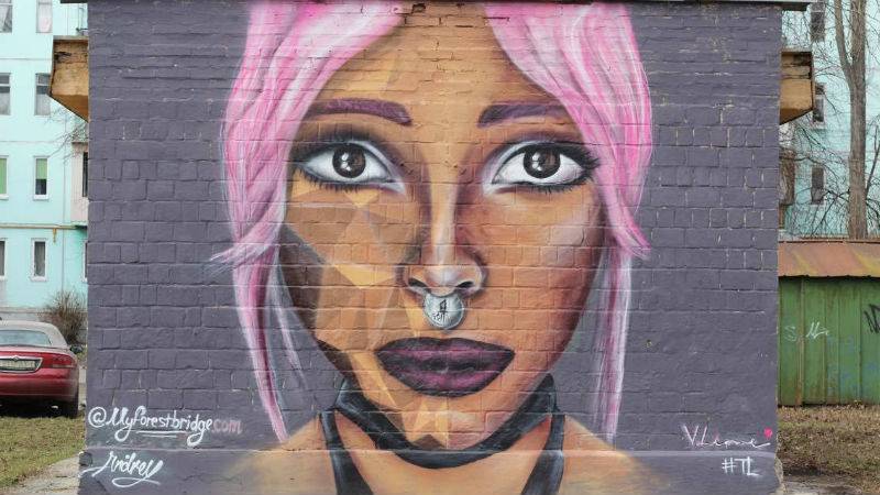 “Идея мурала с девушкой в том, чтобы показать, как в погоне за стереотипной красотой, юные девушки перекраивают свое лицо, превращаются в кукол и теряют индивидуальность. А копейка в носу девушки символизирует цену таким ценностям”, — объясняет идею одного из муралов Андрей.