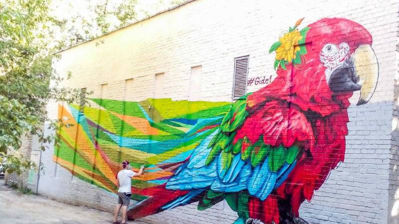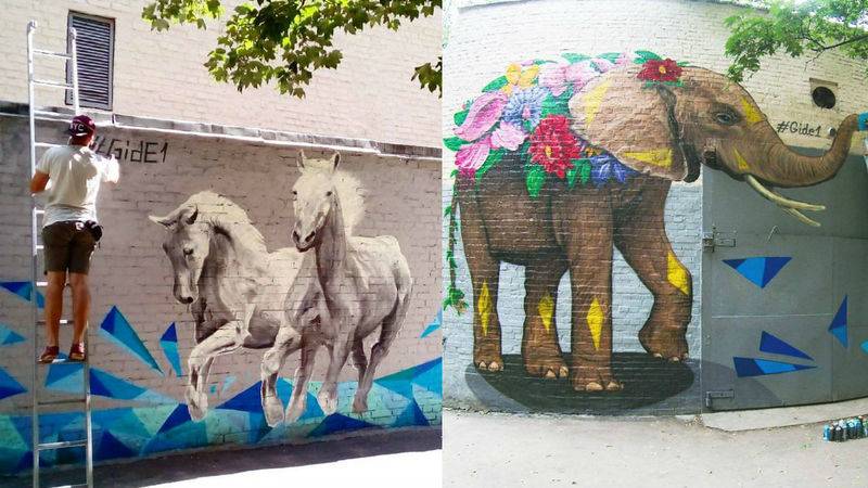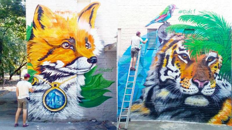 Тот же Виталий Гидеван автор еще одного мурала — на бул. Леси Украинки, 22. Он разрисовал теплопункт с трех сторон, и теперь на нем целый зоопарк: слон, лошади, попугай, тигр и лиса.