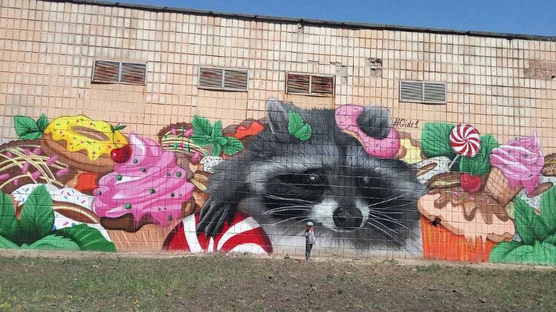 А на ул. Иорданской, 22 Виталий Гидеван создал мурал с енотом. Художник давно разрисовывает город подобными работами. Говорит, что “животные вызывают позитивные эмоции и улыбки, которых так не хватает в каменных джунглях Киева”.