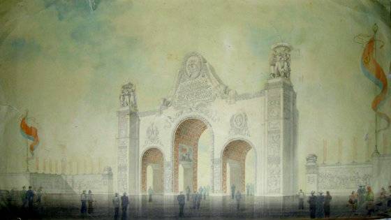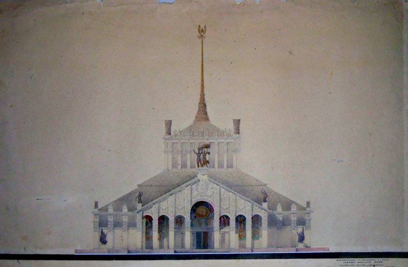 Вход на территорию ВДНХ начинался с античной триумфальной арки, а за ним виднелся главный павильон, который являлся демонстрацией украинского барокко. Яркое цветовое решение и взаимодействие разных материалов - керамики, кирпича, стекла, металла - создает торжественный и яркий вид в противовес военному и серому виду города вокруг.