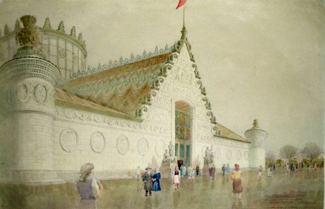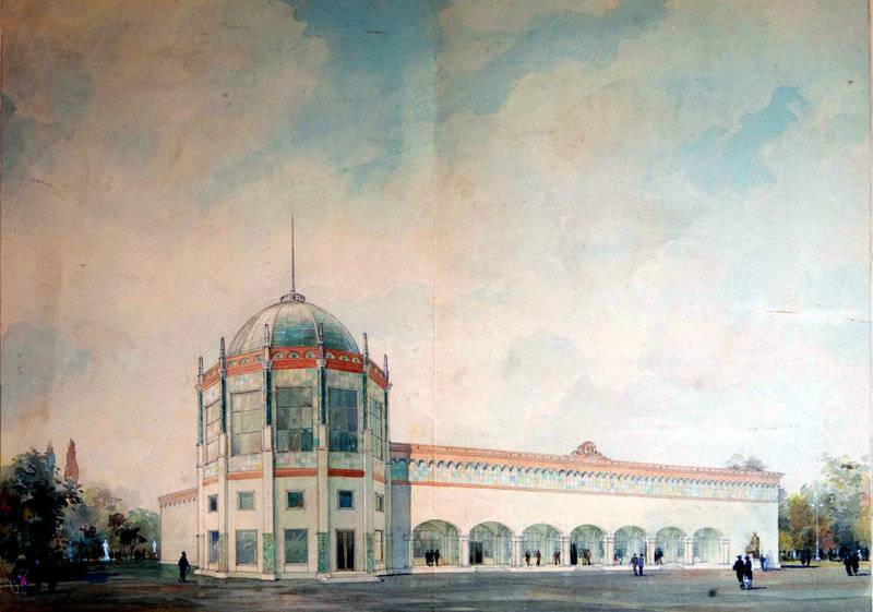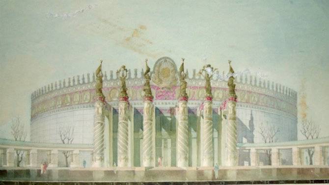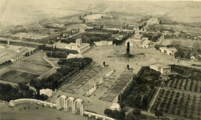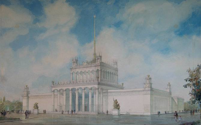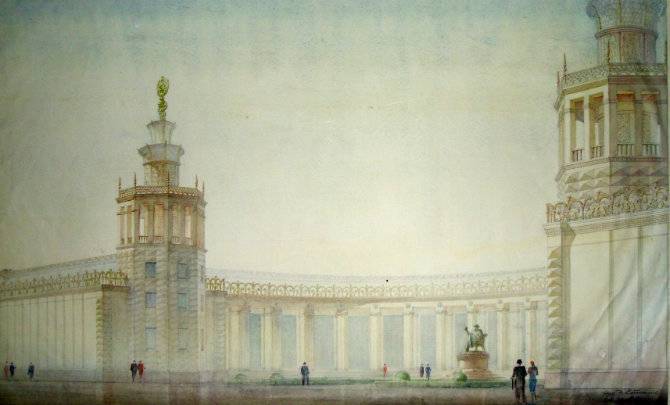 Проект Новикова отличается тем, что архитектурные ансамбли павильонов раскрываются не постепенно, а сразу.