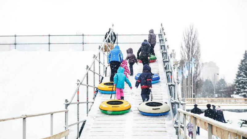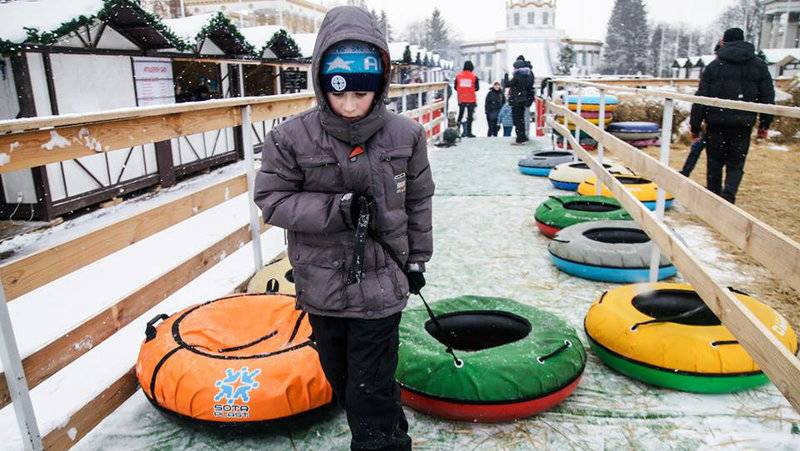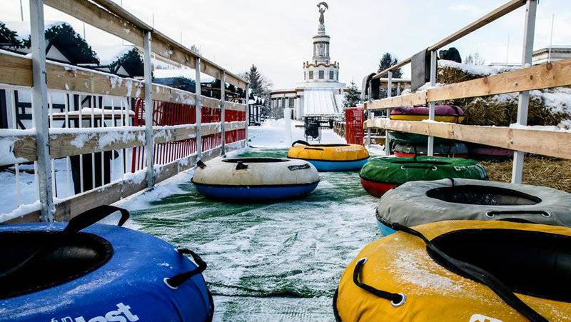 Горок на ВДНГ в этом году будет несколько – для детей и взрослых. Высота большой горки приравнивается к высоте 4-х этажного здания. Спускаться с горок можно будет на сноутьюбах – специальных креслах-таблетках, которые защищают от синяков и ушибов. Даже если на улице растает снег, на этих горках все равно можно будет кататься.