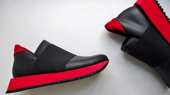 Также есть сникерсы из красной кожи неравномерного окраса и сникерсы из черной кожи, выполненныы на красной геометрической платформе из каучука.