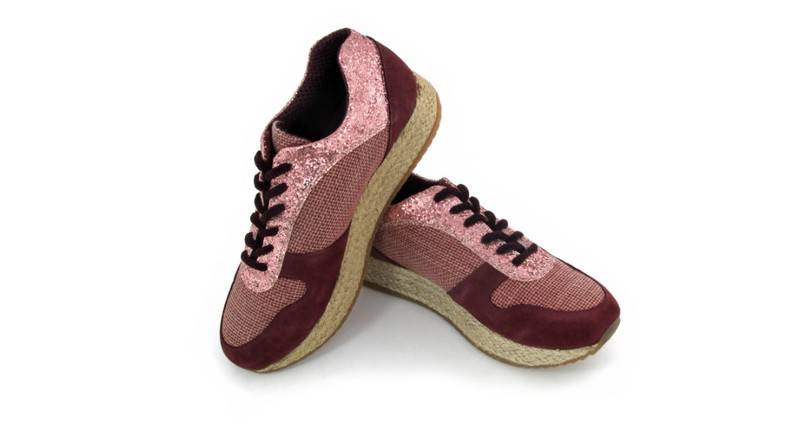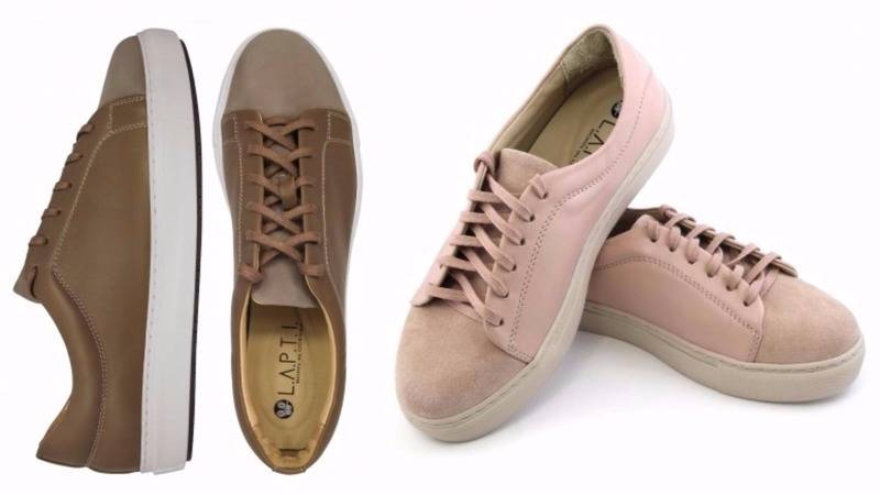 LAPTI также выпустили розовые и коричневые кроссовки в стиле спорт-шик: велюр, текстиль, блестки и подошва с джутовым плетением.
