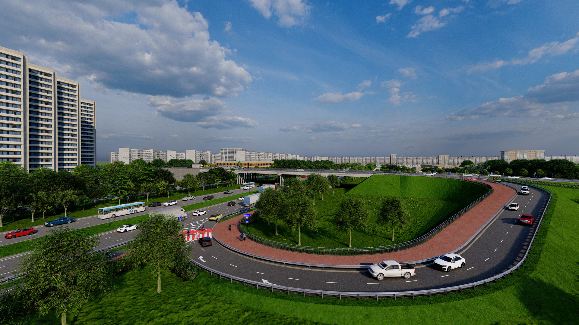 На розв’язці облаштують велодоріжки, а на шляхопроводі – спільний велопішохідний тротуар. Загальна довжина велодоріжок – близько 2,8 км.