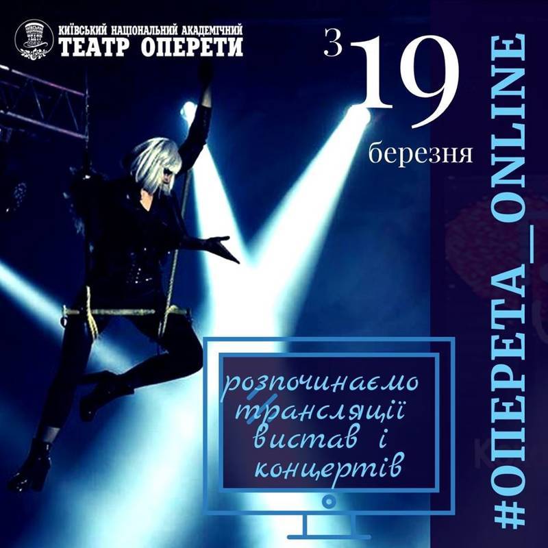 Національна оперета України також транслюватиме вистави і концерти. 19 березня о 19:00 на YouTube-каналі KievOperetta починають відеострімінг: «Шедеври барокової музики »Венеціанська ніч« (19 березня), »Скрипаль на даху« (21 березня), концерт »Штраус в опереті« (23 березня), оперета »Графиня Маріца« (25 березня), концерт »Музика з кінофільмів« (27 березня), мюзикл »Sugar, або В джазі тільки дівчата« (29 березня), концерт »Світові мюзикли. Найкраще!« (31 березня), мюзикл »Сімейка Адамсів" (2 квітня).