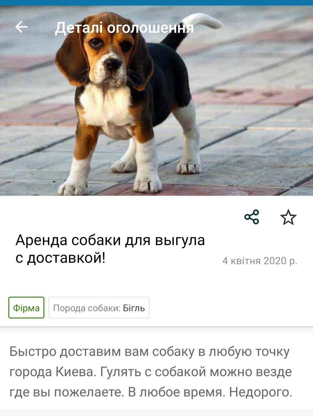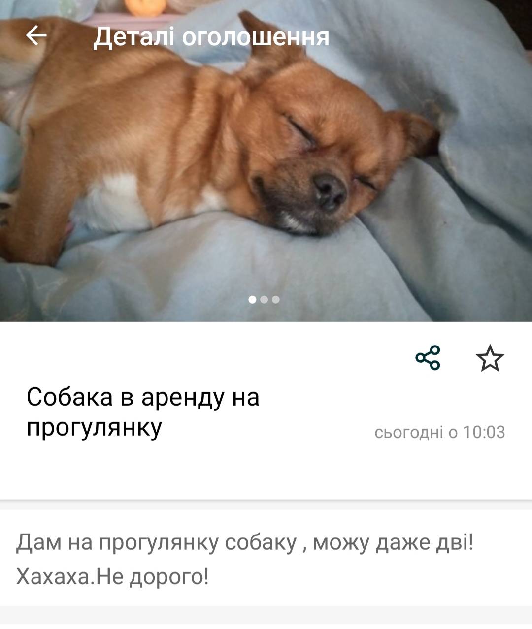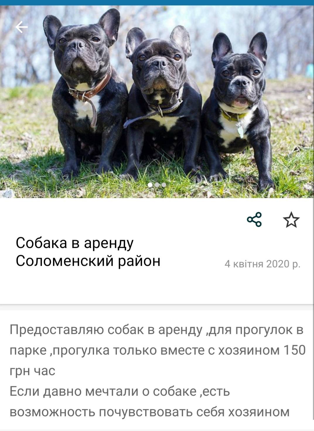 Також собак в оренду здають у Києві, Вінниці, Одесі. Деякі навіть пропонують доставку тварин. У середньому за послугу просять 100-150 грн на годину.
