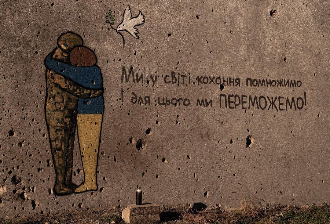 На одній зі стін, посіченій уламками снарядів, зобразили дівчину-Україну в обіймах військового, над якими пролітає голуб миру.